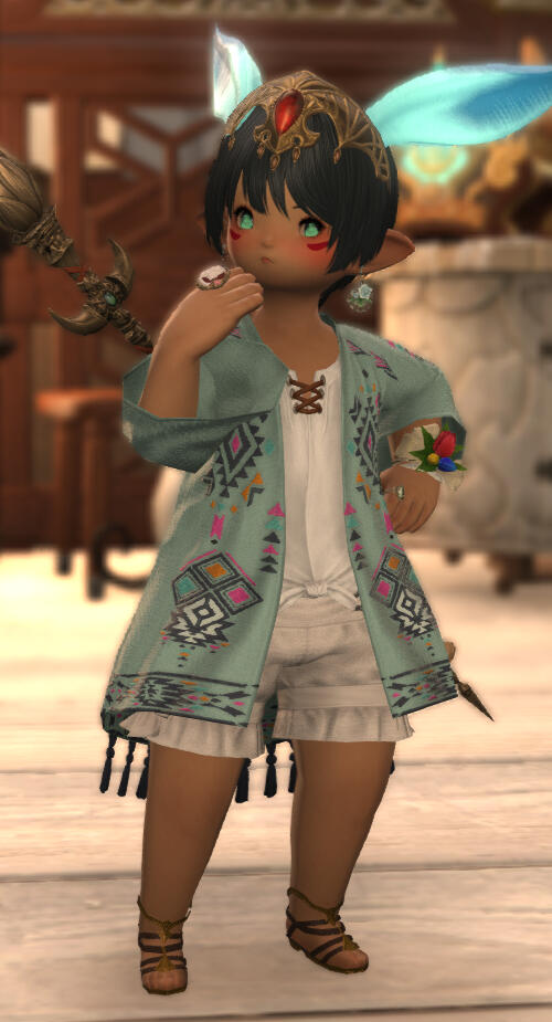 Shoshomi grew up in Ul’dah helping out with her father’s bakery in almost any way she could. She was always timid at the counter with the customers, but her true joy was helping her father bake the sweets. Out of everything they made, she had a particular love of their cupcakes and was nicknamed "Cupcake" by her father as such for it; a nickname that would spread throughout many who frequented their little shop.